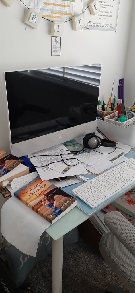 So, I’ve been hard at it since I came back from holiday last month (See what a mess my desk is in above) on the second book in The Uist Girl Series called His Bitter Seed and I’m happy to report that it will be ready for publication in November. As you know, for the first time, I commissioned a developmental editor to look at my work in progress and received her report just before we headed off in our motorhome in August. So, it was sitting waiting for me when I came back. She had made several recommendations for improving the novel and I hope I’ve managed to make the most of her suggestions. My final draft is now out for comment to the six friends and family who are kind enough to read my books and offer constructive critiques. So, fingers crossed they don’t come back with too many negative comments.