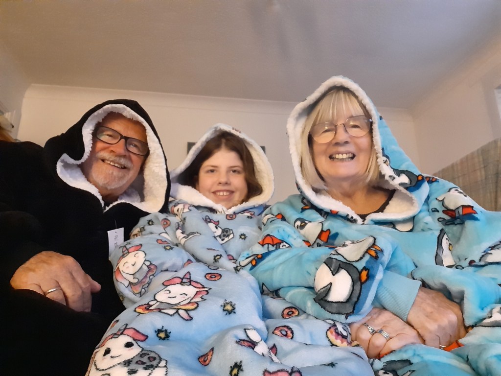 Finally, like many of you, we’ve been trying to think how we can keep warm and reduce our heating consumption over the winter. The photo above is of us with our great granddaughter in our ‘Oodies’ which is Charlie’s contribution to keeping us warm over the coming season and I must say it’s very cosy.